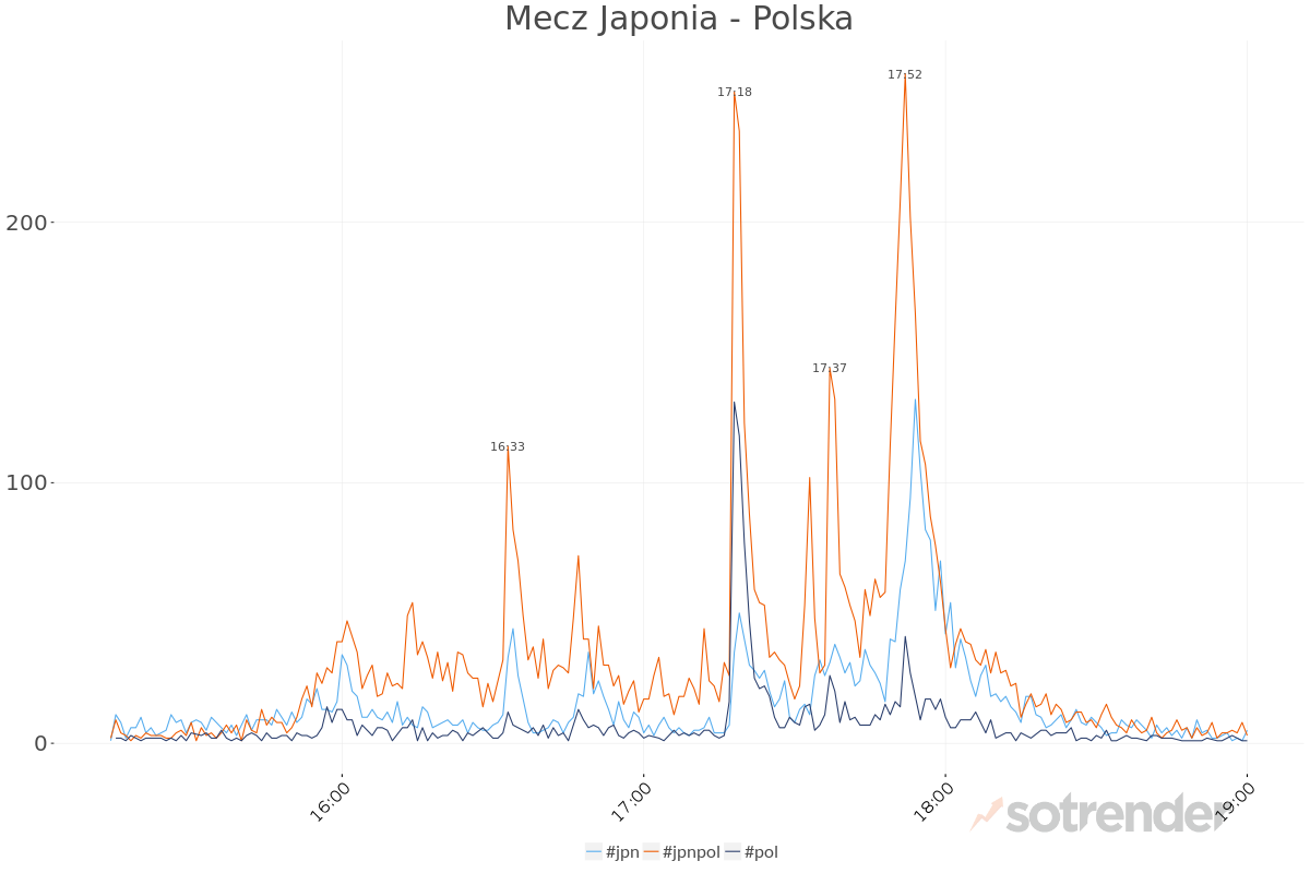 W ostatniej kolejce w grupie H oczy wszystkich były zwrócone na spotkanie Senegal-Kolumbia, ponieważ to tam miało się rozstrzygnąć, kto awansuje dalej. Dlatego starcie Polski z Japonią- mecz o polski honor – obserwowało dużo mniej użytkowników Twittera. W najbardziej intensywnych momentach pojawiało się czterokrotnie mniej tweetów niż w przypadku poprzedniego meczu Polaków.