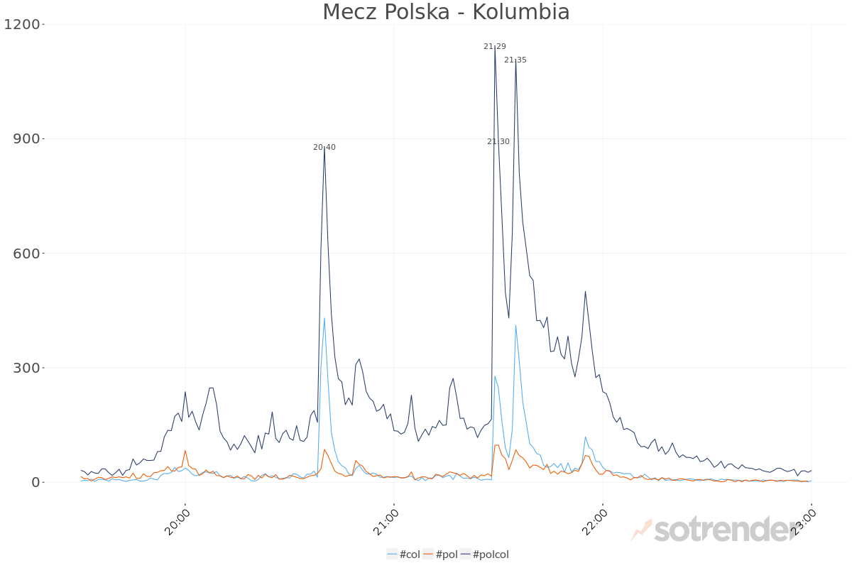 Nas jednak najbardziej interesują mecze Polaków. Najwięcej tweetowano podczas drugiego starcia, z Kolumbią, która skutecznie pozbawiła biało-czerwonych marzeń o awansie do ⅛ finału. Piki na wykresie to oczywiście trzy gole strzelone przez Minę, Falcao i Cuadrado oraz koniec meczu. W przypadku tego meczu najpopularniejszym hashtagiem był hashtag meczowy #POLCOL. Warto też zauważyć, że spotkanie to cieszyło się dużo większym zainteresowaniem na Twitterze niż mecz otwarcia – różnica była aż trzykrotna.