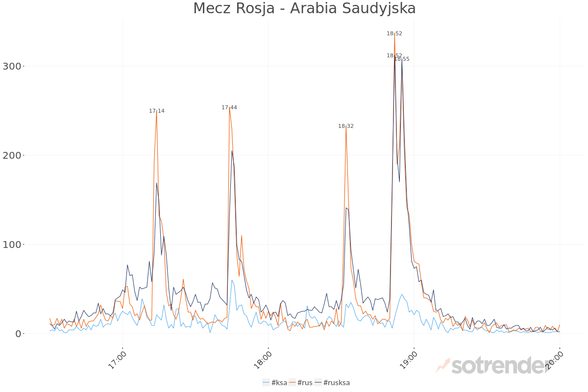 Najczęściej tweetowano krótko po zdobyciu bramek. Widać też, że z trójki hashtagów #RUS, #KSA i #RUSKSA najpopularniejszy był ten odnoszący się do Sbornej.