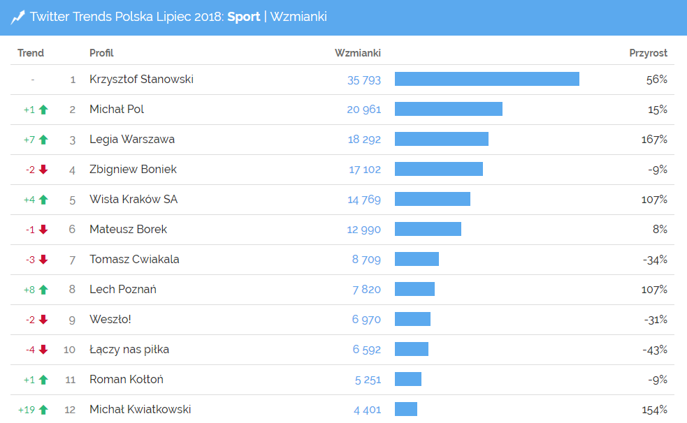 Profile o największej liczbie wzmianek w kategorii Sport | Twitter lipiec 2018