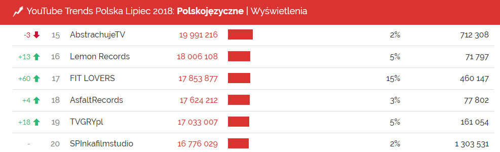 A skoro o awansach mowa, kanał Fit Lovers, pary trenerów personalnych, którzy nie ograniczają swoich treści tylko do wizyt na siłowni i metod na idealny sześciopak na brzuchu, w ubiegłym miesiącu awansował aż o 60 miejsc w rankingu pod względem wyświetleń i z prawie 18 mln wyświetleń uplasowała się na 18. miejscu wśród wszystkich kanałów pojawiających się w YouTube Trends. Fit Lovers awansowali również w rankingu kanałów z największą liczbą aktywności użytkowników, o 16 miejsc.