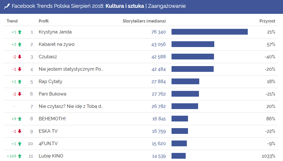Profile o największym zaangażowaniu w kategorii Kultura i sztuka | Facebook, sierpień 2018