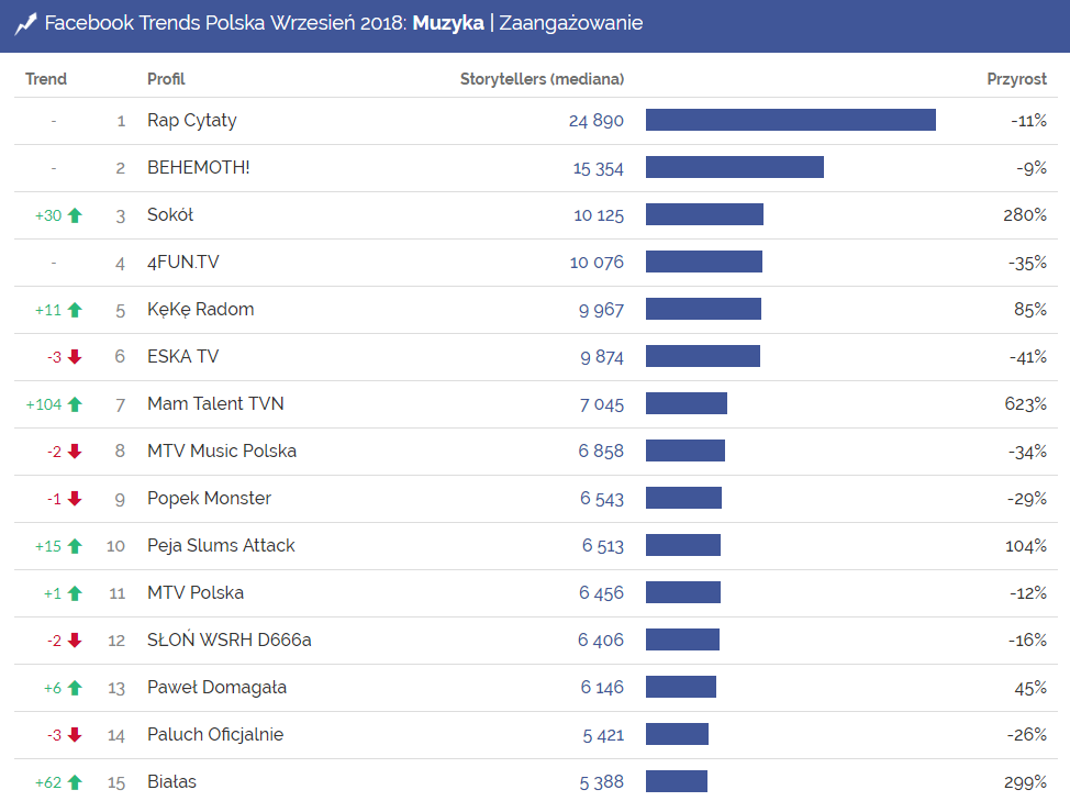 Profile o największym zaangażowaniu w kategorii Muzyka na Facebooku we wrześniu