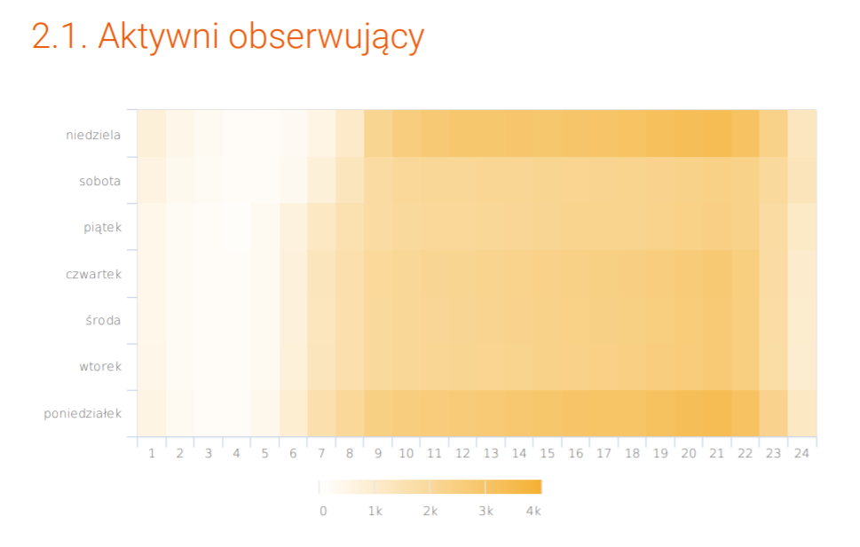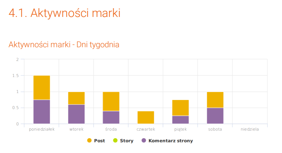 - Podział aktywności na dni tygodnia i godziny, dzięki czemu dowiecie się, kiedy marka jest najaktywniejsza na Instagramie.