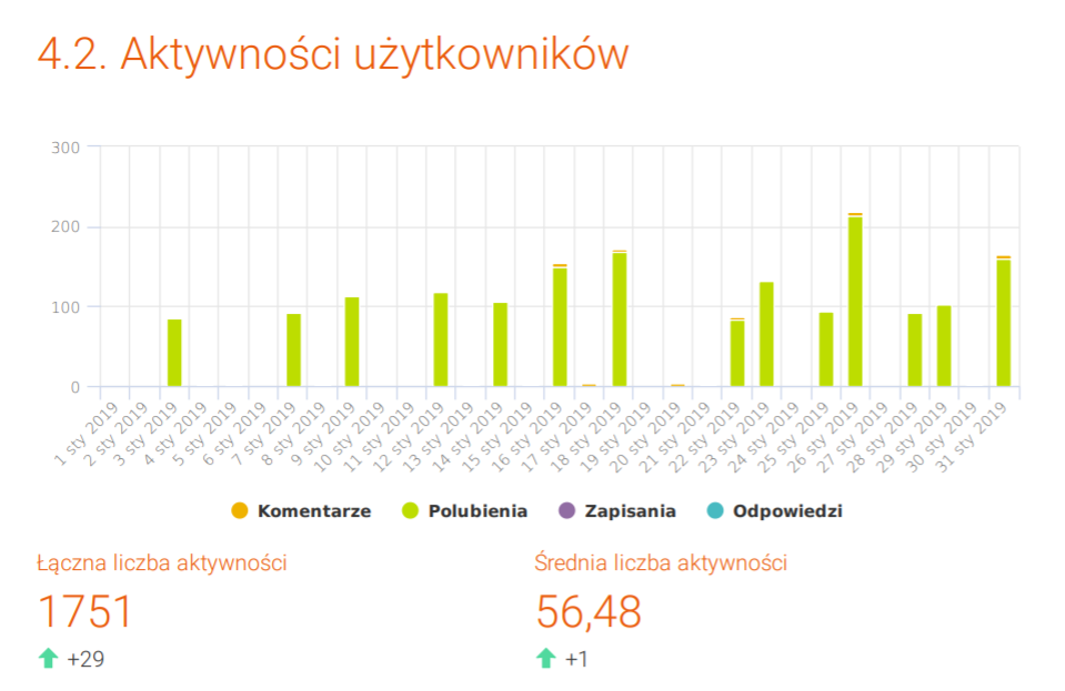 - Łączna i średnia liczba aktywności w badanym okresie,