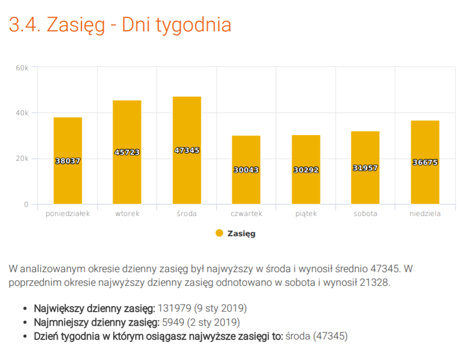 - estymowany zasięg w analizowanym okresie (estymowany, ponieważ Facebook podaje zasięg w interwałach siedmio- i dwudziestoośmiodniowych, a w naszych raportach możecie wybrać dowolny okres do analizy),
