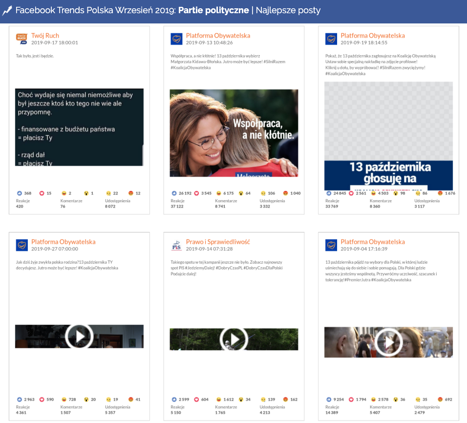 Z kolei w zestawieniu najlepszych postów w kategorii Parte polityczne przodował Twój Ruch. Kolejne 3 kreacje należały do Platformy Obywatelskiej.