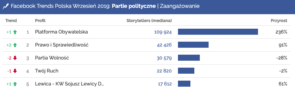 Partie polityczne o największym zaangażowaniu na Facebooku, wrzesień 2019