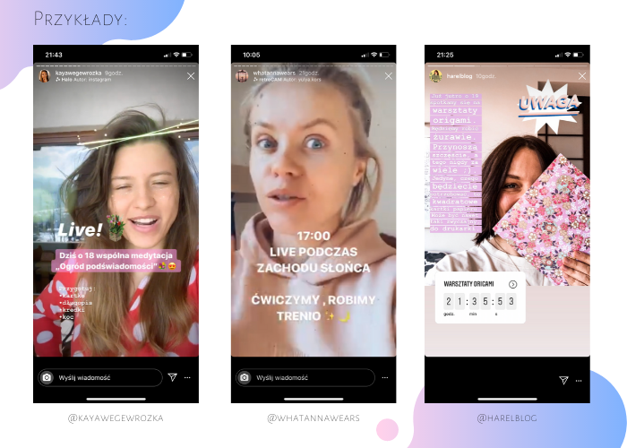 Relacją Live może być nawet zwykła sesja Q&A, czyli pogadanka z odbiorcami na interesujące ich tematy. Fajną koncepcją są również rozmowy w formie wywiadu – znajdziecie je na Instagramie Honoraty Skarbek (@honkabiedronka) oraz Anny Skury (@whatannawears) – obydwie dziewczyny przeprowadzają rozmowy z innymi inspirującymi kobietami.