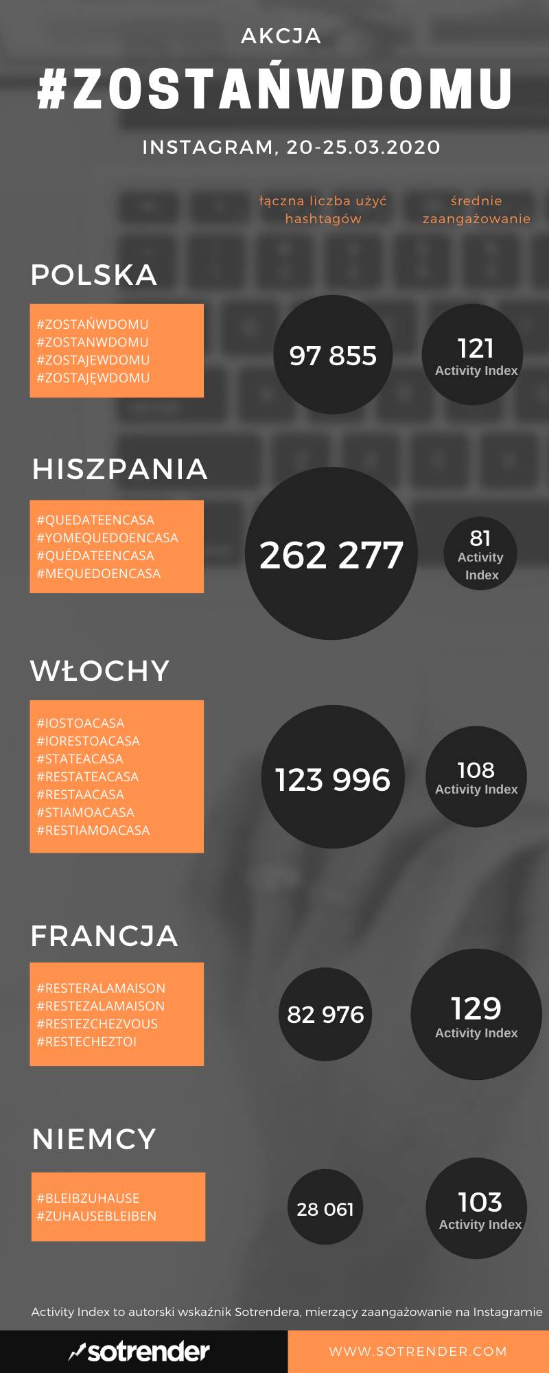 Od piątku 20 marca do środy 25 marca, Polacy na Instagramie użyli hashtaga #zostańwdomu (#zostanwdomu) oraz #zostajęwdomu (#zostajewdomu) ponad 97 tysięcy razy.