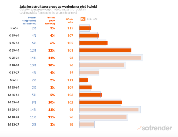 W naszym badaniu jesteśmy w stanie również wykazać, jaki procent całej populacji na Facebooku oraz jaki procent wybranej grupy docelowej interesuje się danym zagadnieniem.