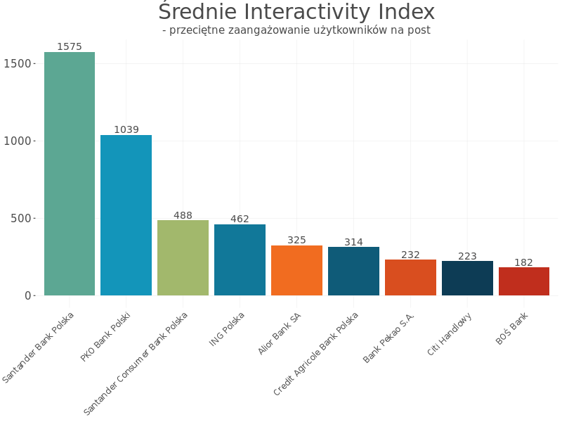To właśnie Santander Bank Polska najbardziej angażował swoich fanów w analizowanym okresie, o czym świadczy najwyższy średni wskaźnik Interactivity Index, który przedstawia zaangażowanie pod treściami.