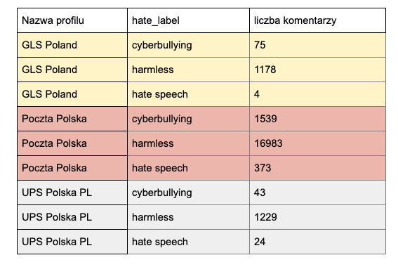 Na analizowanych przez nas profilach zdecydowanie najwięcej komentarzy opatrzonych jako hate speech oraz cyberbullying odnotowaliśmy na profilu Poczty Polskiej.