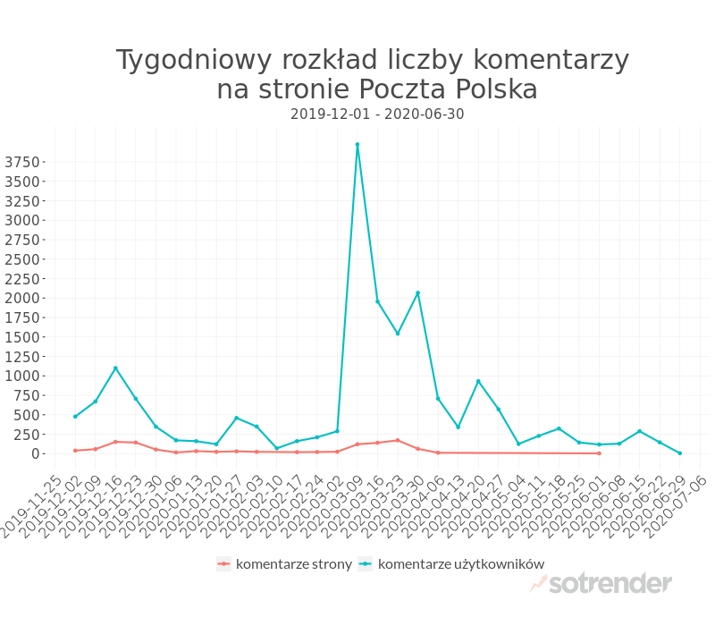 Wreszcie strona, na której pojawiało się najwięcej komentarzy: Poczta Polska. Internauci często komentowali treści na tej stronie w okresie przedświątecznym (w jednym tygodniu grudnia na stronie ukazało się ponad 1000 komentarzy). Jednak w marcu, kiedy ogłoszono stan epidemii aktywność komentujących gwałtownie wzrosła, a liczba publikowanych przez nich w poszczególnych tygodniach komentarzy nawet kilkukrotnie przerosła tę z okresu przed Bożym Narodzeniem. Wyraźny wzrost odnotowaliśmy również w połowie kwietnia.