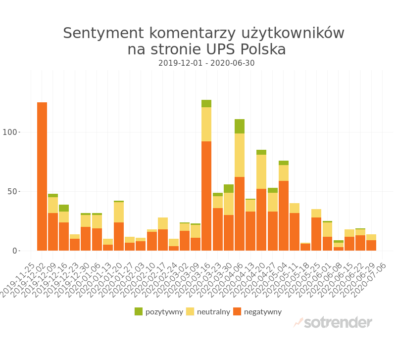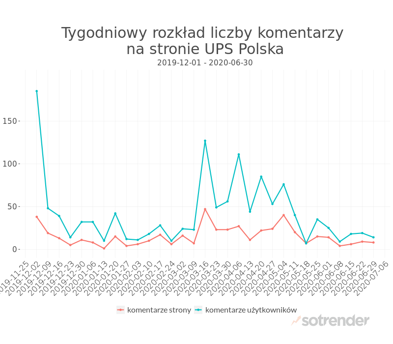 Aktywność użytkowników pod postami publikowanymi przez UPS Polska nie odbiega znacząco od naszych oczekiwań – w pierwszej połowie grudnia, a więc w okresie przedświątecznej gorączki i częstszego zamawiania prezentów czy dekoracji, użytkownicy publikowali najwięcej komentarzy. Kolejny znaczący wzrost liczby komentarzy odnotowaliśmy na stronie w marcu, zaraz po wprowadzeniu stanu epidemii. Użytkownicy zostawiali na stronie wiele komentarzy również w kolejnych miesiącach, wzrosty w liczbie komentarzy w poszczególnych tygodniach są widoczne aż do połowy maja.
