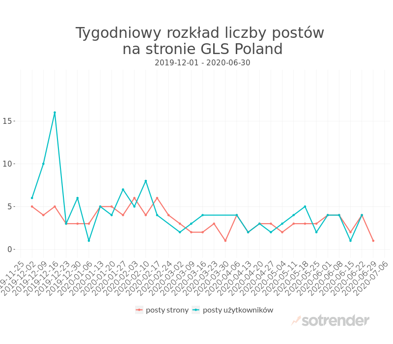 Wśród 3 analizowanych stron, jedynie na profilu GLS Poland użytkownicy zamieszczali posty i było ich stosunkowo dużo. Na 106 postów opublikowanych przez GLS, kolejnych 122 dodali użytkownicy (średnio około 5 dziennie).