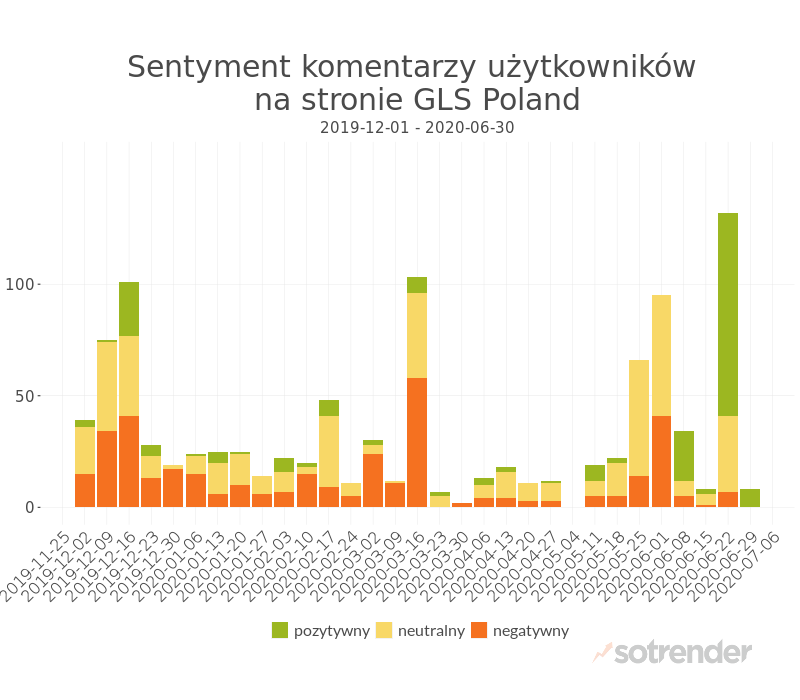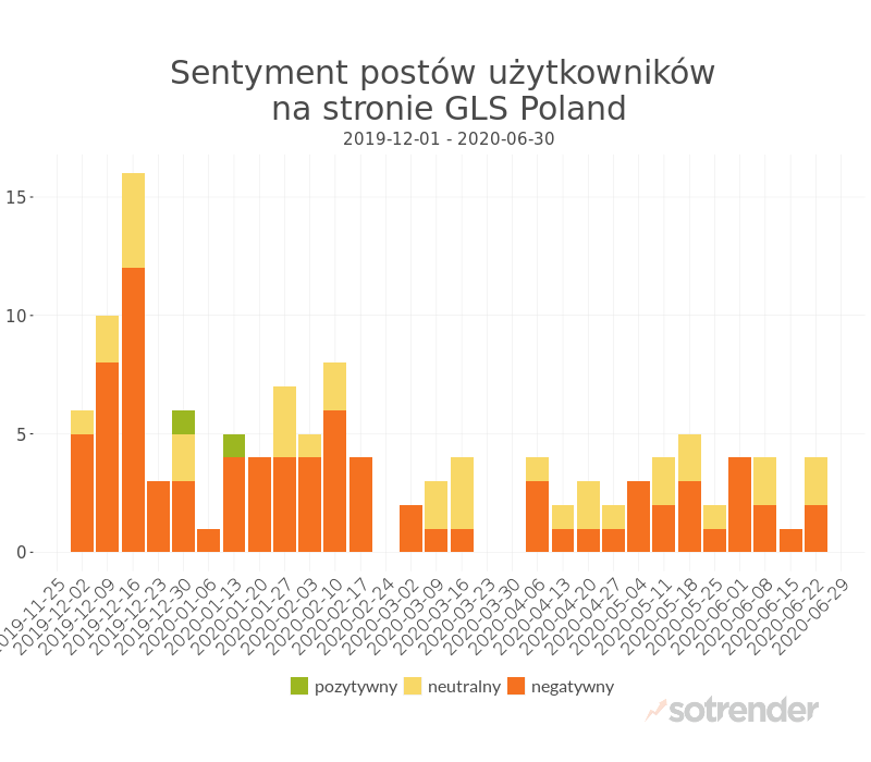 W porównaniu do UPS Polska oraz Poczty Polskiej, na stronie GLS opublikowano znacznie więcej komentarzy o sentymencie pozytywnym i neutralnym. Zdecydowanie wpływ na to miał konkurs organizowany w maju i czerwcu, jednak także w poprzednich miesiącach, pojawiało się więcej pozytywnych (i neutralnych) komentarzy niż na profilach konkurencji.