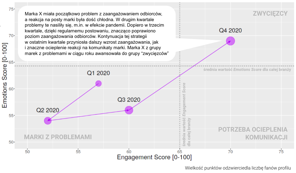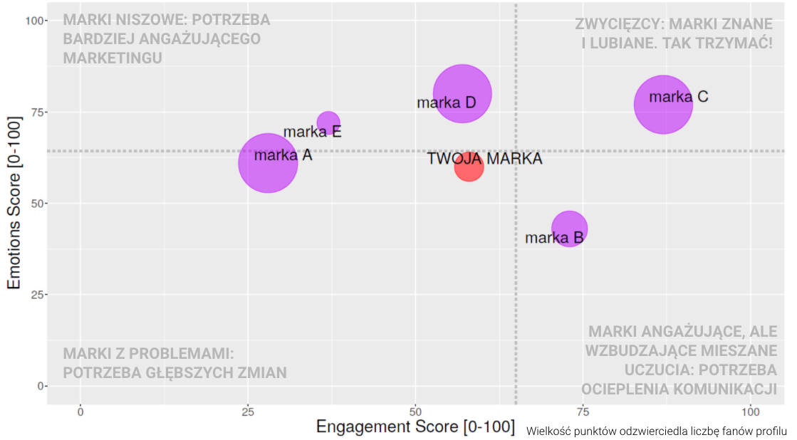 Niezależnie, jaką marką zarządzamy, kluczowa jest analiza i świadomość, jak jest ona postrzegana na tle konkurencji. Wychodząc z założenia, że składa się na to wiele czynników, łączna analiza naszych dwóch wskaźników – Engagement Score i Emotions Score – pozwala wyznaczyć pozycję strategiczną marki.