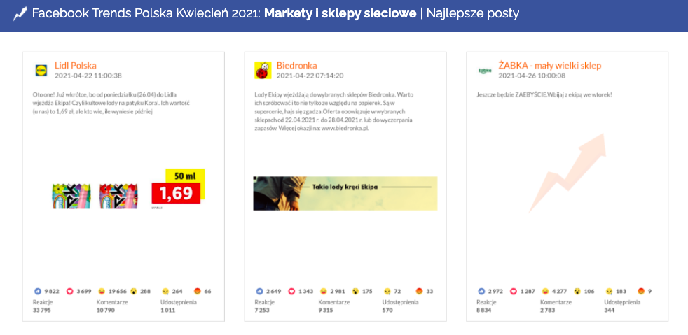 Lody Ekipy stały się w kwietniu prawdziwym marketingowym i sprzedażowym hitem. W kategorii Markety i sklepy sieciowe trzy najbardziej angażujące posty miesiąca dotyczyły właśnie premiery lodów Ekipy w Lidlu, Biedronce oraz Żabce.