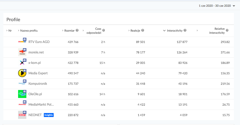Jak ambitnym celem było dążenie do pozycji lidera pokazują wyniki osiągane w czerwcu 2020 roku, kiedy na profilu Neonet łączna liczba reakcji nie przekroczyła 1500, a INI wynosiło zaledwie 4 tys. Tymczasem liczba reakcji na profilach konkurencji była nawet sześćdziesięciokrotnie większa.