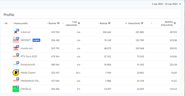 Liczba reakcji na profilu Neonet na Facebooku w marcu 2021 w porównaniu do konkurencyjnych profili