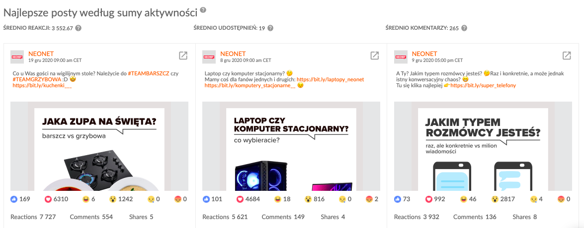 Najbardziej angażujące posty na profilu Neonet na Facebooku w grudniu 2020 roku