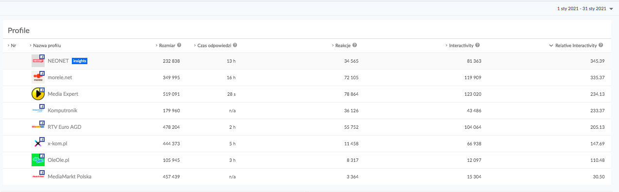 Wskaźnik Relative Interactivity Index dla profilu Neonet w styczniu 2021