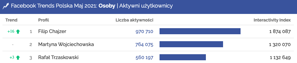 Profil Filipa Chajzera był numerem jeden w kategorii Osoby pod kątem łącznej liczby aktywności w maju 2021 na Facebooku