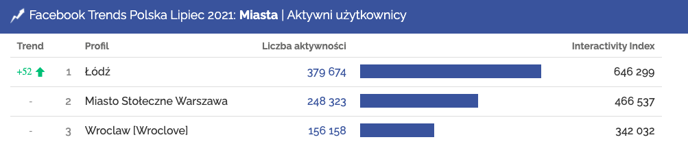 Miasta o największej liczbie aktywności w lipcu 2021 na Facebooku