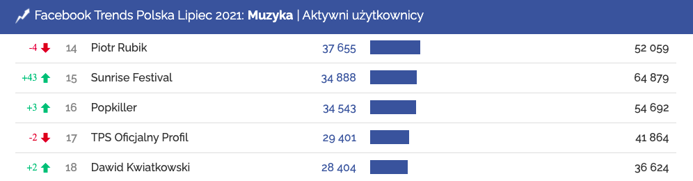 Muzyka | Aktywni użytkownicy, Facebook, lipiec 2021