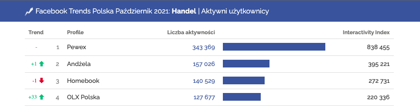 Profile o największej liczbie aktywności, Handel | Facebook, październik 2021