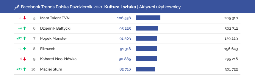 Profile o największej liczbie aktywności, Kultura i sztuka | Facebook, październik 2021