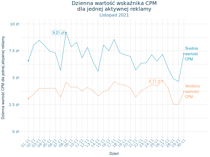 Jeśli chodzi o CPM, najwyższą wartość wskaźnik przyjął 8 listopada, i była to kwota 9 zł 21 gr. W Black Friday średni CPM wyniósł około 7 zł. Z kolei najniższa średnia wartość wskaźnika CPM wyniosła 4 zł 70 gr, dokładnie 29 listopada.