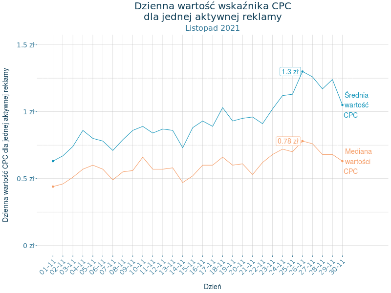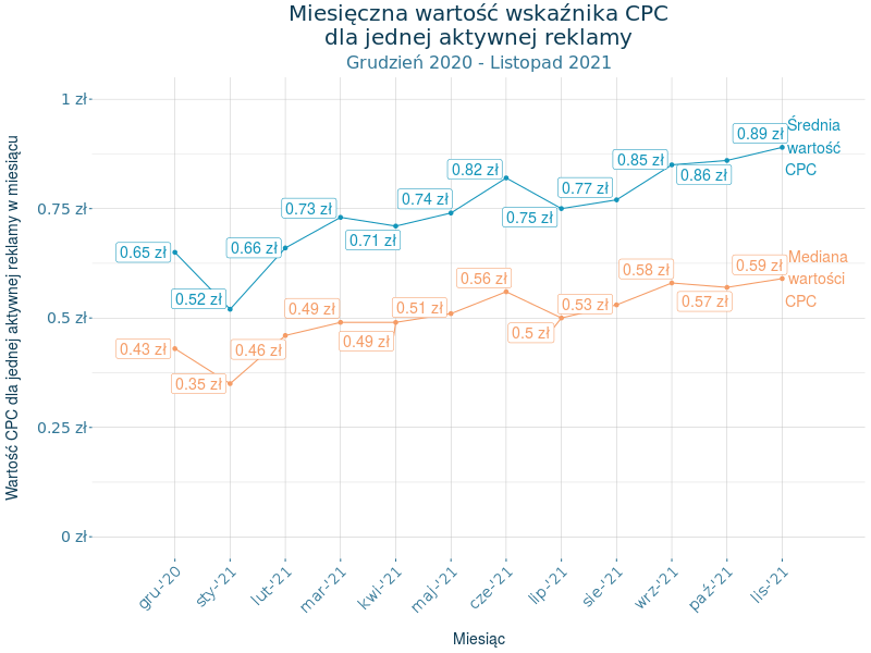 Najniższa i najwyższa mediana wartości CPC wyniosła odpowiednio: 35 gr w styczniu i 59 gr w listopadzie.