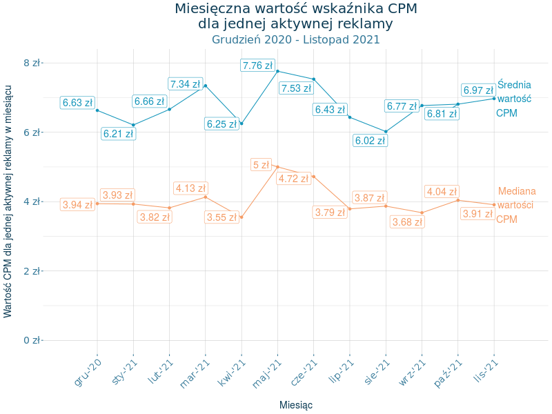 Na przestrzeni minionego roku, najwyższy średni CPM wyniósł 7 zł 76 gr w maju, zaś najniższy – 6 zł 2 gr w sierpniu.