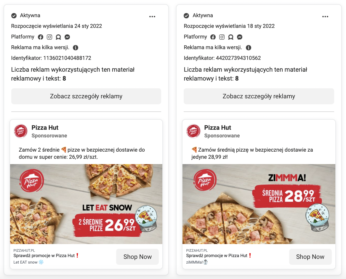 W Bibliotece reklam sprawdzisz daty rozpoczęcia wyświetlania wybranych reklam, platformy, na których były emitowane oraz liczbę użytych kreacji reklamowych. Po kliknięciu w szczegóły wybranej reklamy, zobaczysz również różne jej wersje.