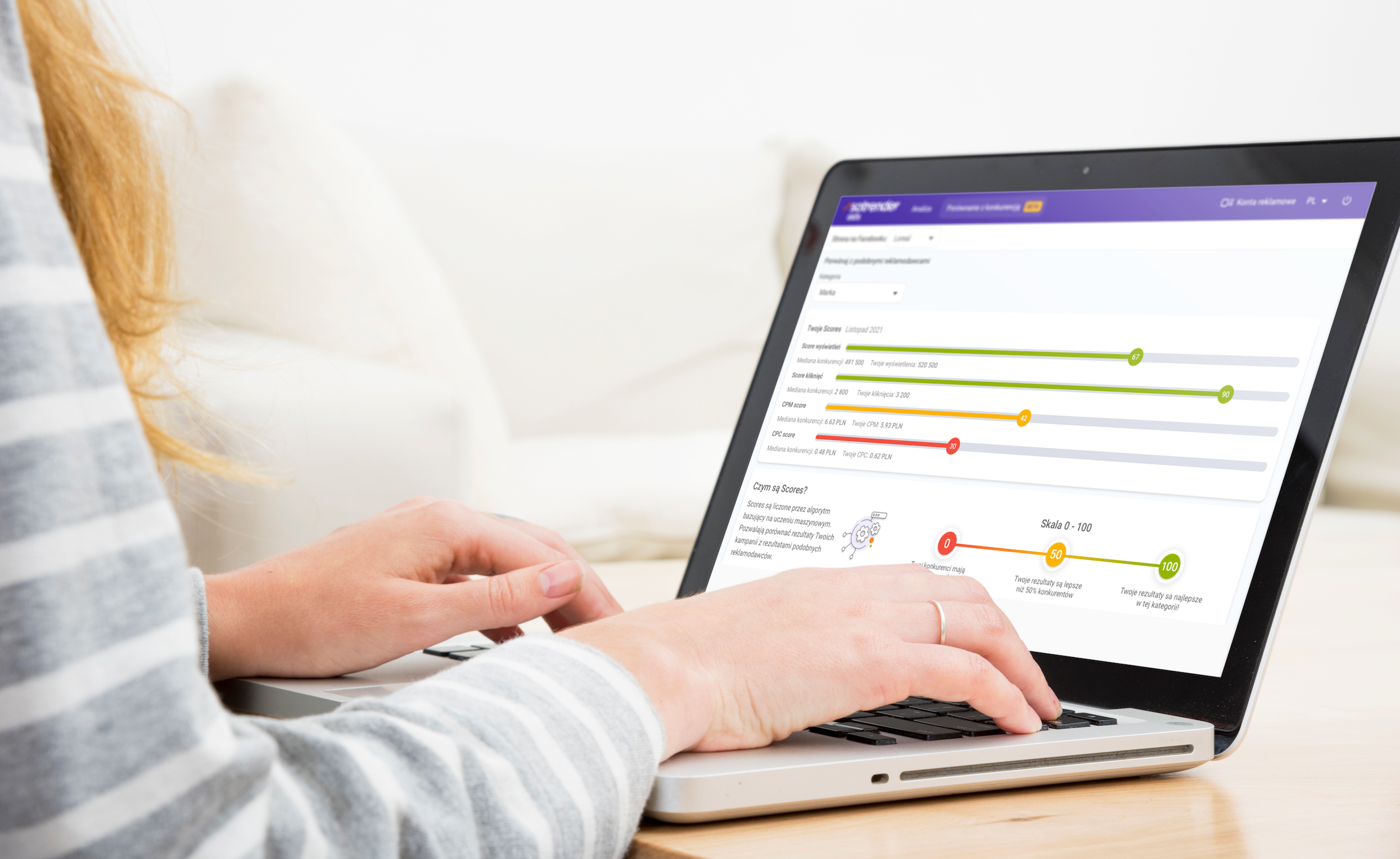 Choć w aplikacji dostępne są dokładne wartości, takie jak CPC czy CPM, nie musisz wcale ich znać. Tego, jak radzisz sobie na tle konkurencji, dowiesz się dzięki naszym score’om. Szybko zobaczysz, czy pod kątem danego wskaźnika wyniki Twoich kampanii są lepsze, czy gorsze, od konkurencji.