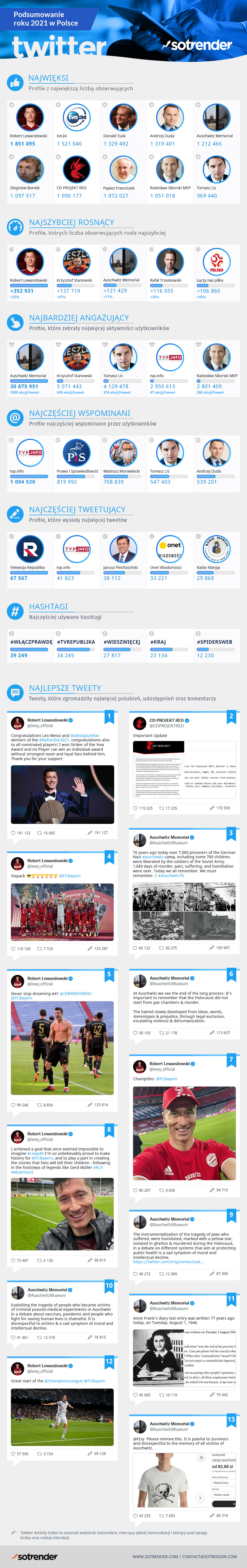 Do dopełnienia zestawienia za 2021 rok brakuje nam jeszcze najlepszych tweetów. Czyje wpisy były najbardziej angażujące? W pierwszej piętnastce top postów znalazło się najwięcej treści od Roberta Lewandowskiego i Auschwitz Memorial, choć w najlepszych postach zobaczymy także wpis CD PROJEKT RED, który zgromadził pokaźną liczbę – ponad 40 mln – aktywności.