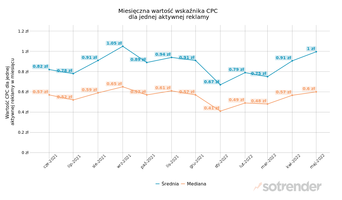 Od marca, średnie stawki reklamowe rosną – w maju, średnia miesięczna wartość wskaźnika CPC dla jednej aktywnej reklamy wyniosła 1 zł, czyli o 9 gr więcej niż w ubiegłym miesiącu. Mediana średniego CPC wyniosła z kolei 60 gr, czyli o 3 gr więcej niż w kwietniu.