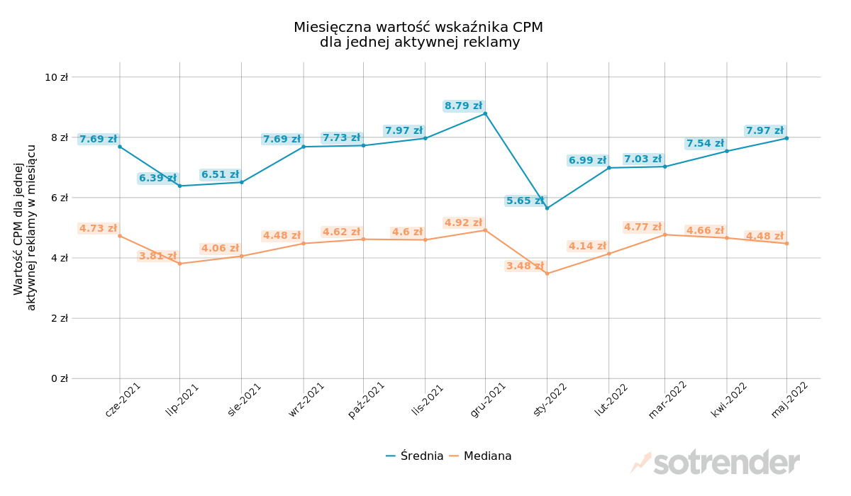Również średni CPM jest od marca coraz wyższy. W maju przyjął wartość 7,97 zł, czyli o 43 gr więcej niż w kwietniu. Nieco inaczej wygląda to w przypadku mediany średniego CPM. W maju wyniosła ona 4,48 zł, czyli o 18 gr mniej niż w kwietniu.