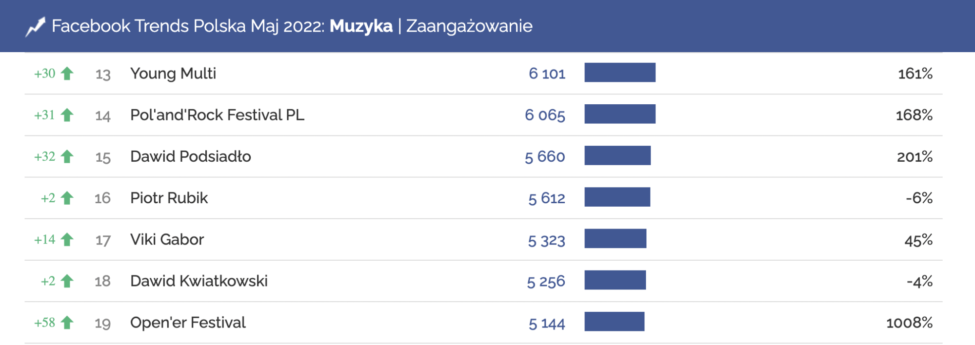 W maju, profil Open’er Festival regularnie aktualizował tegoroczny line-up, a posty o zbliżających się występach gwiazd takich, jak The Killers, Don Toliver czy Taco Hemingway, zachęcały użytkowników do pozostawiania entuzjastycznych komentarzy. W maju, profil Open’er Festival awansował o 58 pozycji w kategorii Muzyka, w rankingu zaangażowanych użytkowników.