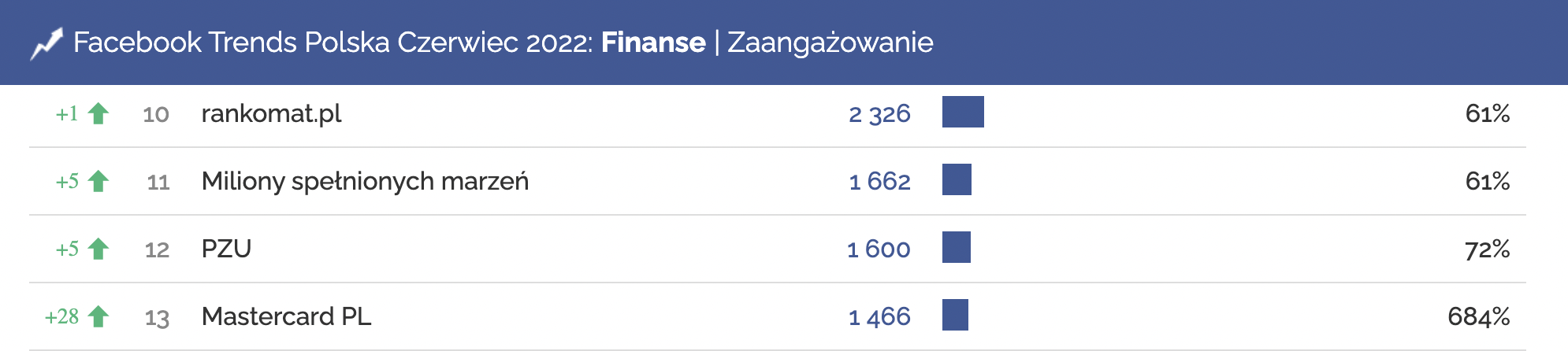 Profil Mastercard awansował o 28 pozycji w rankingu Zaangażowanie w kategorii Finanse, i znalazł się na 13 miejscu.