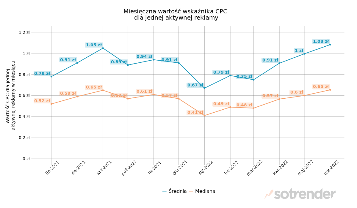 W czerwcu, w porównaniu do maja, średnia miesięczna wartość CPC dla jednej aktywnej reklamy była o 8 gr wyższa i wyniosła 1 zł 8 gr. To o 41 gr więcej niż w styczniu. Z kolei mediana średniego CPC wzrosła w czerwcu o 5 gr w porównaniu do maja.