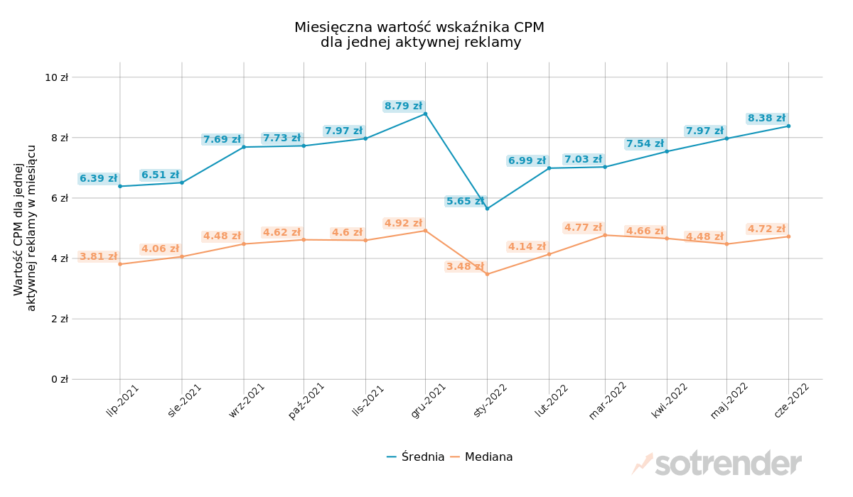 Nieco większy wzrost odnotowaliśmy w przypadku CPM. W czerwcu, średni CPM wyniósł 8 zł 38 gr, podczas gdy w maju przyjął wartość 7 zł 97 gr, czyli o 41 gr mniej. Z kolei mediana średniego CPM wyniosła w czerwcu o 24 gr więcej niż w maju.