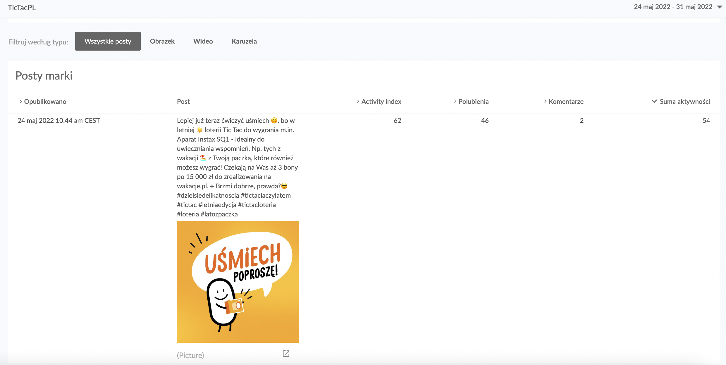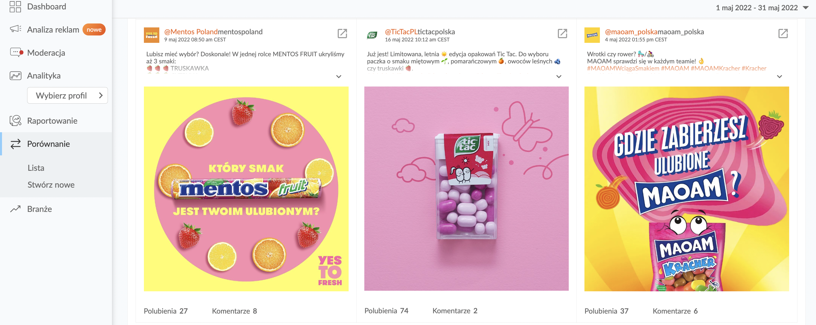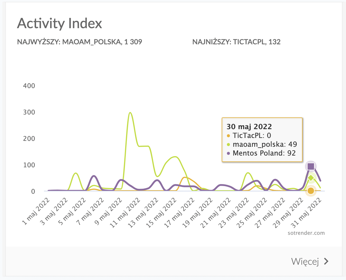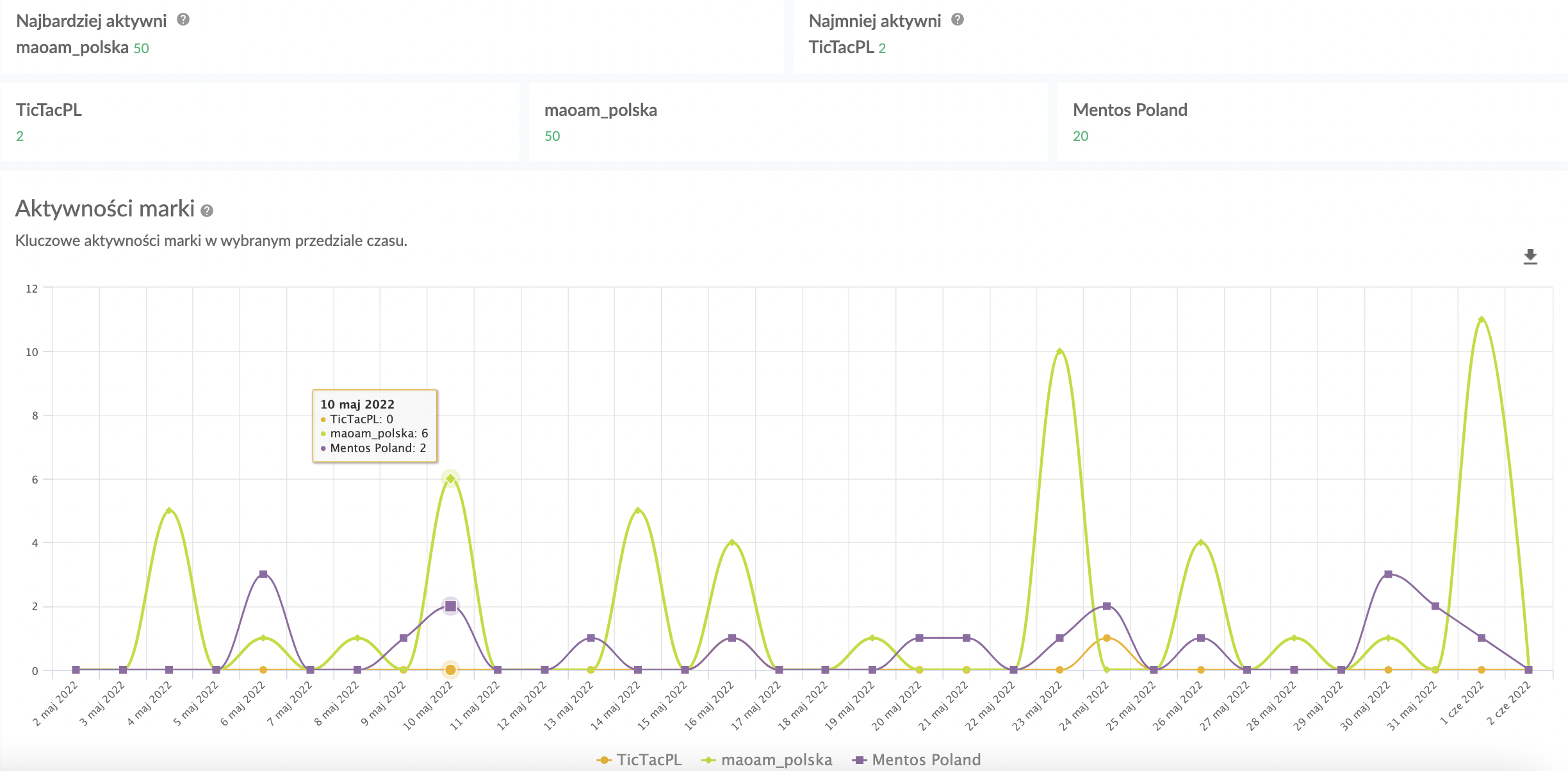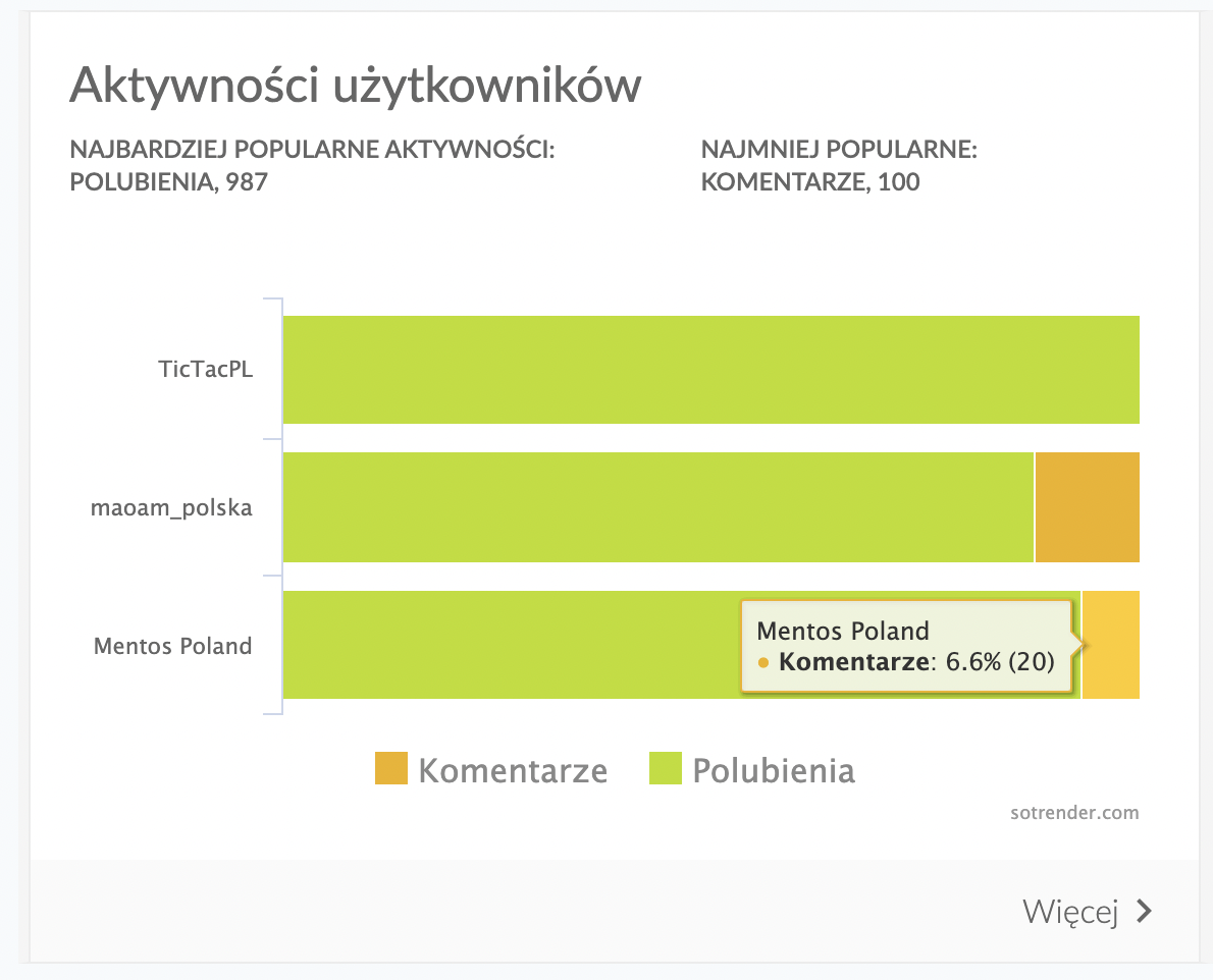 Jak widać, mimo że profil Maoam jest najmniejszym profilem w analizowanej grupie, to właśnie on zdobywa największe zaangażowanie odbiorców. Nie tylko ma najwyższy wskaźnik Activity Index, ale jest też jedynym profilem, na którym pojawiają się komentarze użytkowników.