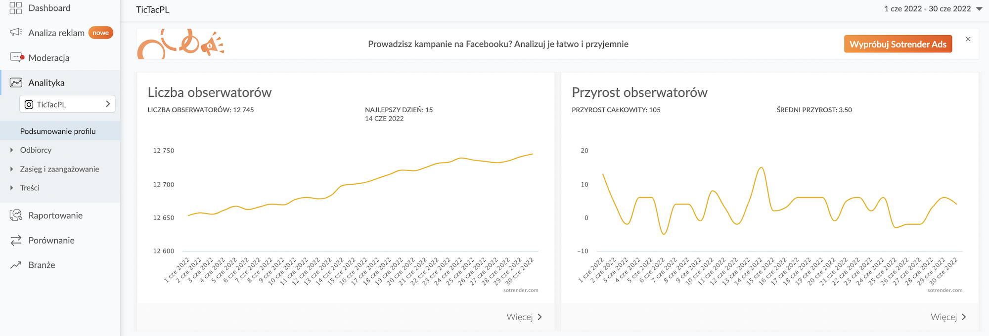 Pamiętaj jedynie, że w Sotrenderze, ale także jakiejkolwiek innej aplikacji analitycznej, masz możliwość dodawania i analizowania jedynie kont biznesowych. Jeśli więc Twoi konkurenci nie korzystają z profilu biznesowego, niestety nie będziesz mógł monitorować ich wyników. Nie martw się, oni tracą jeszcze więcej, ponieważ nie analizują nawet własnych statystyk. 😉