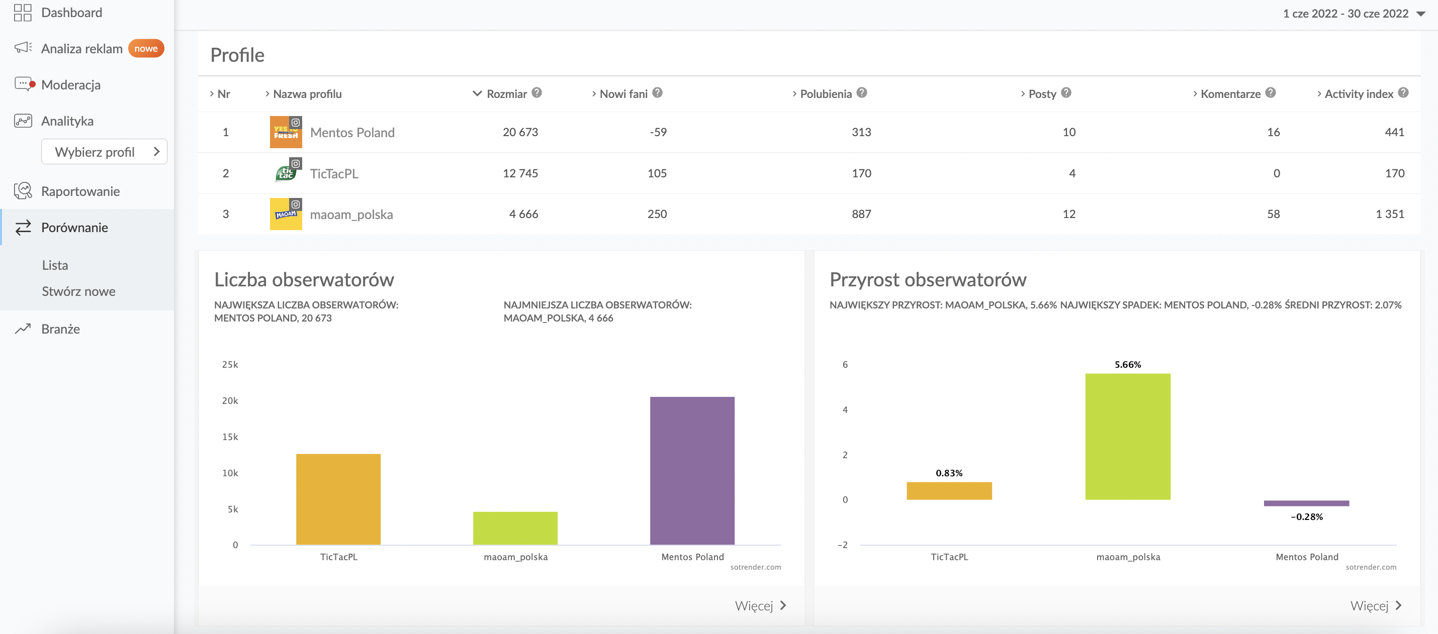 Korzystając ze stworzonej już grupy porównawczej, dowiesz się, jak wygląda zaangażowanie na profilu Twoim i Twoich konkurentów.