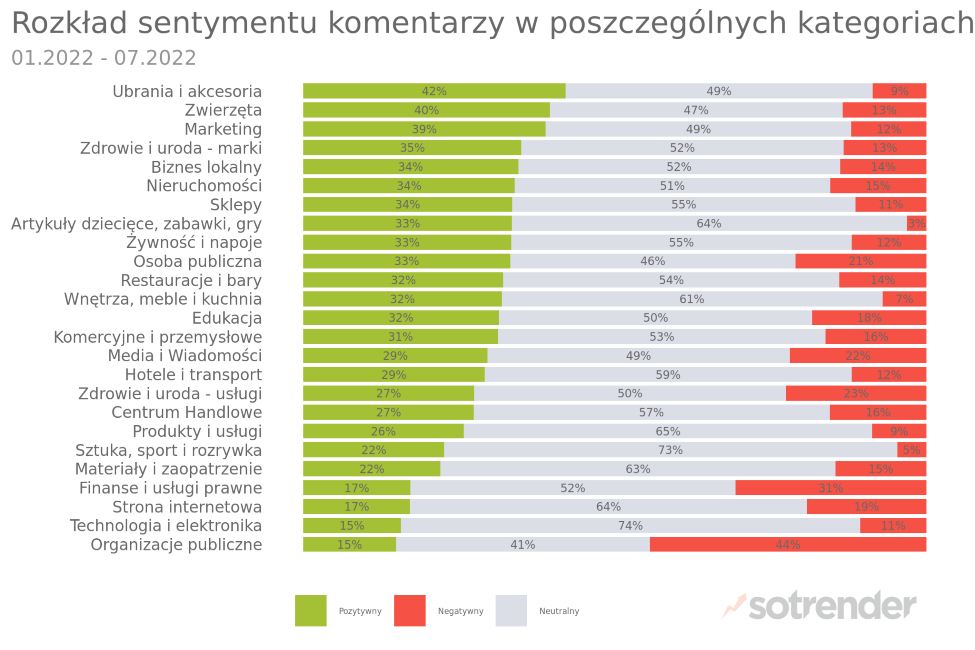 Najwięcej pozytywnych komentarzy, 42%, pojawiło się pod reklamami z kategorii Ubrania i akcesoria. Ponieważ ich celem jest zachęcenie odbiorców do zakupu, tego typu kreacje reklamowe przygotowywane są zazwyczaj w taki sposób, by zachęcać aniżeli wzbudzać kontrowersje.