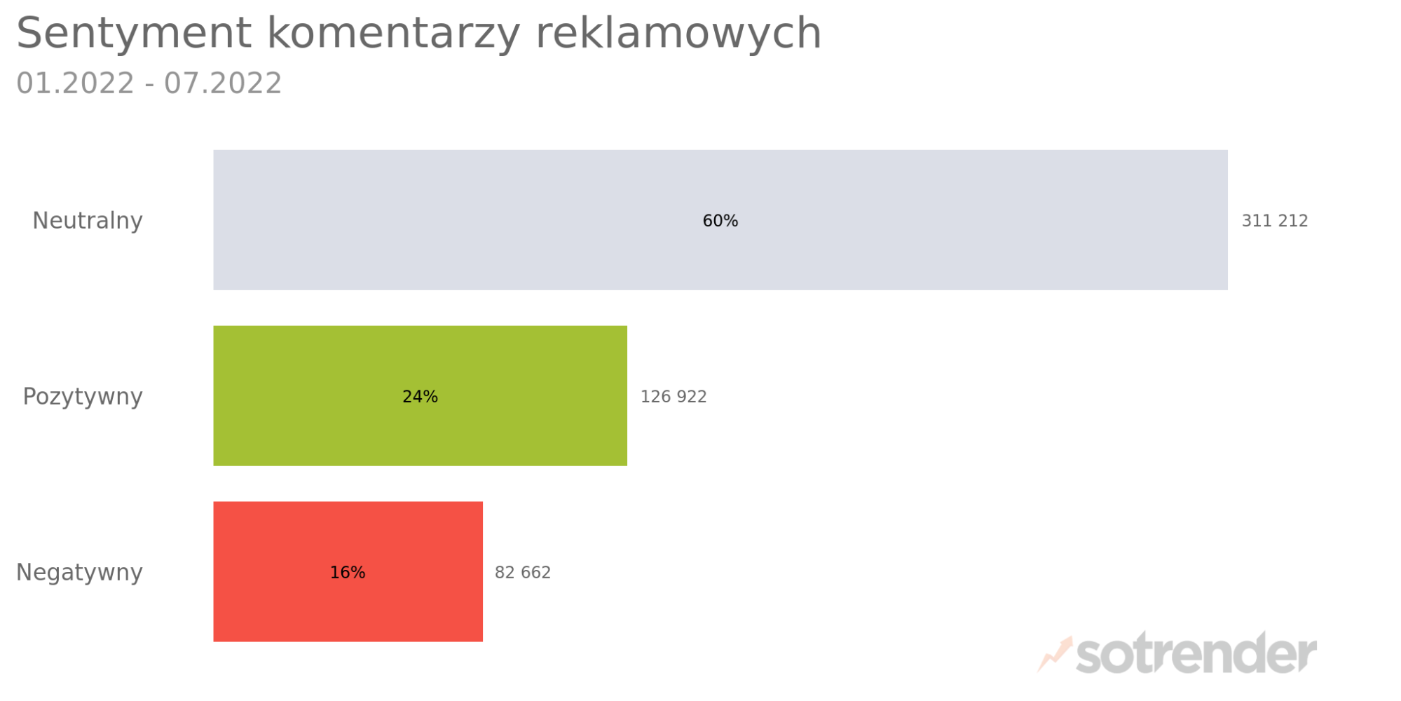 Nasz zespół przeanalizował ponad 500 000 komentarzy reklamowych pod kątem ich sentymentu, dla reklam na Facebooku targetowanych na Polskę. Analizowane komentarze reklamowe dotyczyły okresu od 1 stycznia do 31 lipca 2022 roku.