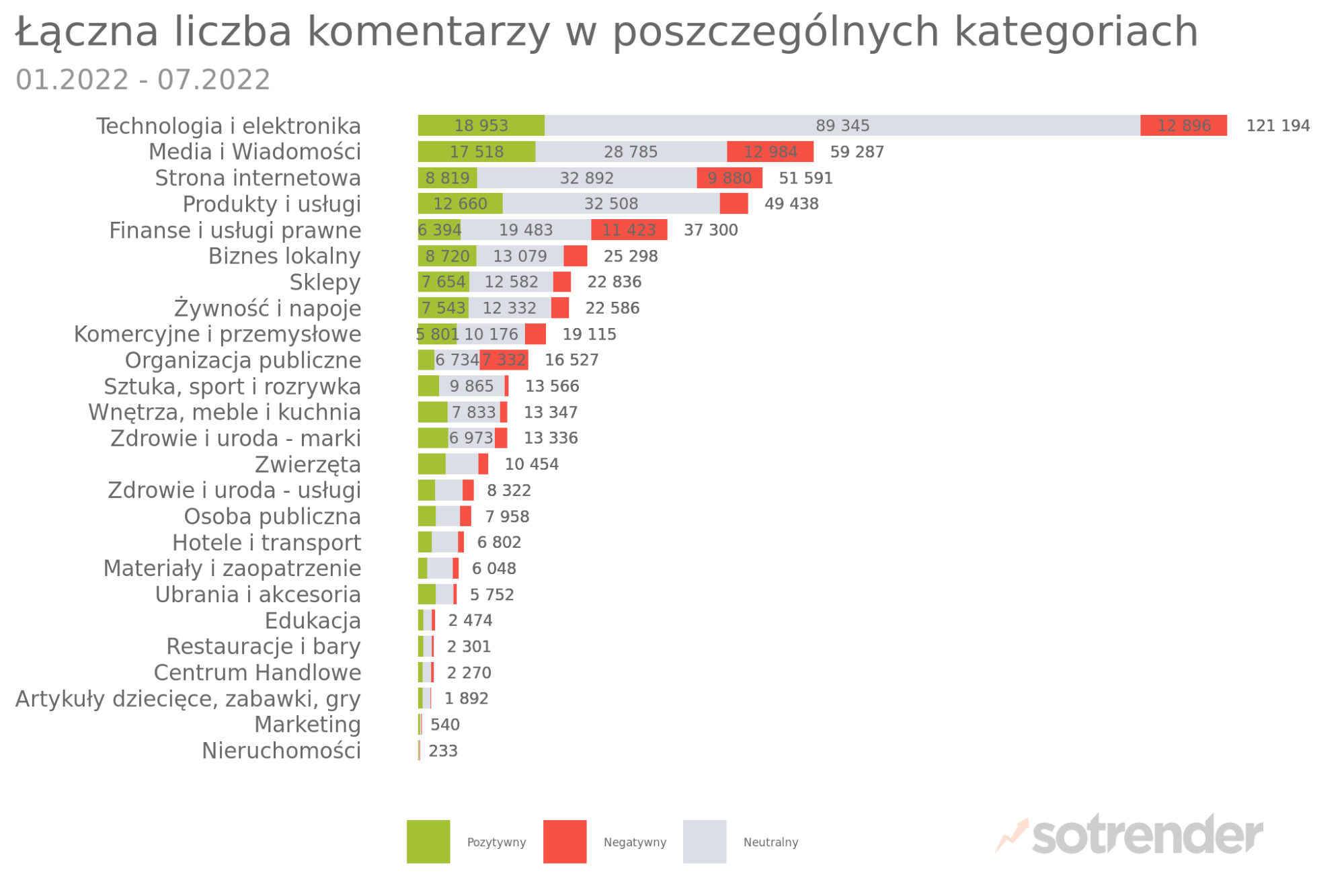 Sprawdziliśmy też, w których kategoriach reklamy zebrały największą i najmniejszą liczbę komentarzy, i jak rozkładał się sentyment komentarzy reklamowych w tych kategoriach.